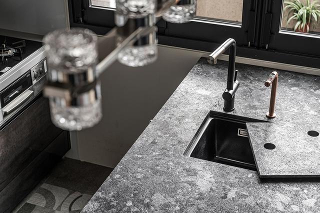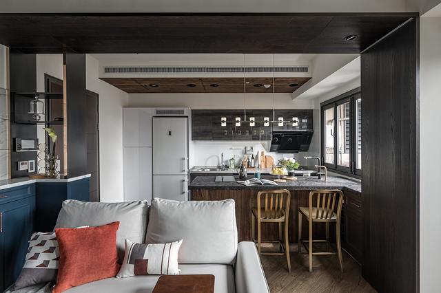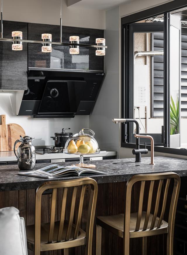 深色的中岛台台面,是屋主亲自挑选的仿古水洗咖啡绒大理石,粗旷又自然的纹理非常有质感。