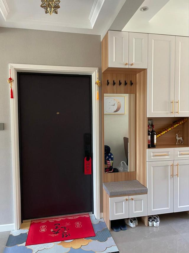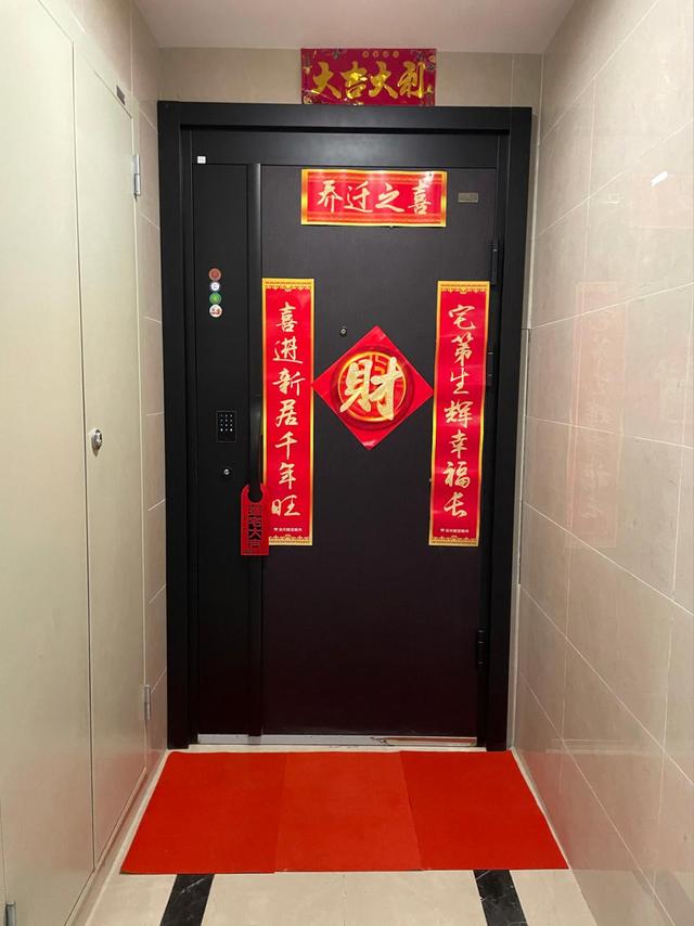 从电梯出来的入户大门外的视角,原本是猪肝红的大门,重新换了这种偏黑色的指纹锁入户大门,显得更有质感,更安全,效果更有档次。生活需求仪式感,乔迁新居对联是不可缺少的一部分。墙上贴着对联显得比较喜庆,加上地面红色的地垫,还没进屋就可以感受到浓浓的氛围。
