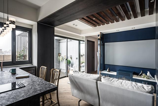 客厅的整体配色采用了英伦范十足的绅士蓝,客厅天花板的位置还加入了木饰面格栅的形式,摆脱了传统的繁琐与沉闷,以更加简约利落的设计语言塑造空间气质,彰显不凡审美品味。