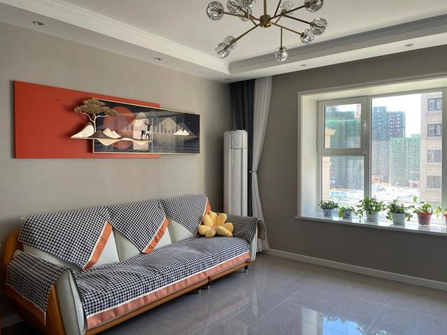 客厅没有阳台,考虑到家里有小孩子,所以放弃了茶几,显得空间看起来宽敞一些,也是为了腾出更多空间,方便家里小孩玩耍。布置了布艺沙发,坐着很舒服。套着沙发套,更耐脏一些。墙上挂的装饰画,视觉上很抢眼,装饰效果还是蛮不错的哈。有个飘窗,可以当小沙发使用。