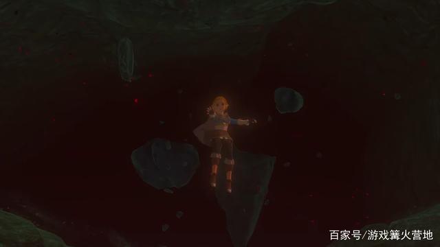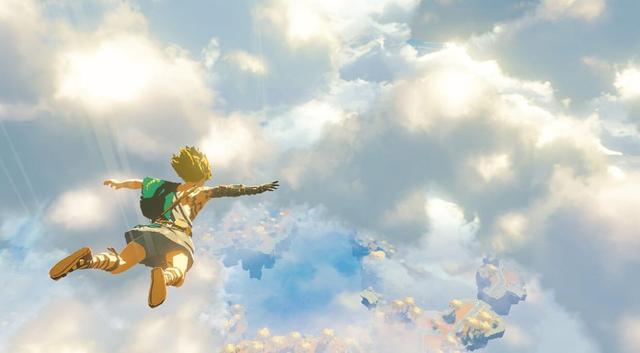 紧接在塞尔达公主被黑暗吞没的画面之后的,是林克从云端坠向大地的场景。按照正常的演出逻辑来推断的话,这很可能展现的是林克为了拯救跌落悬崖的公主纵身越下,但却惊讶地发现自己来到了某个地方的上空,只能像跳伞一样降落到这个世界上的情节。