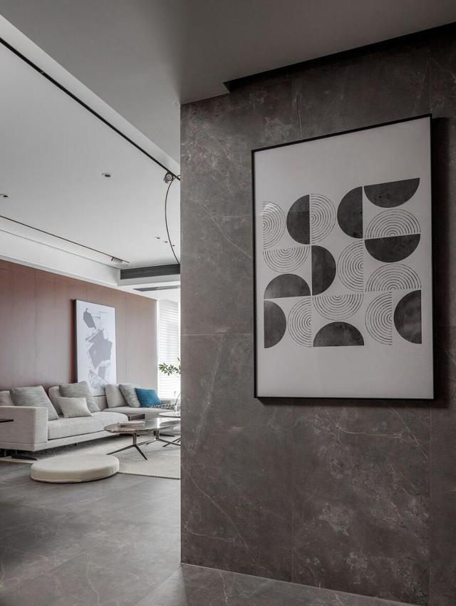 进门对面就有一块端景墙,墙地一体式的瓷砖处理,也似乎从一入户开始,就为空间奠定了统一的基调。虽说这种设计手法,弱化了空间的层次感,但一幅抽象装饰画配置,却也起到了不错的点缀作用。