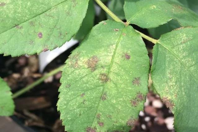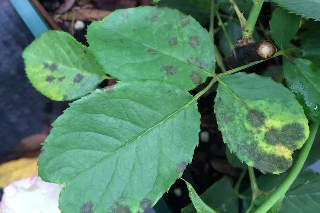 黑斑病,黑斑病是梅雨季节里的高发病,但也是防治的关键期。梅雨季节里,多雨潮湿,温度较高,这是黑斑病菌最喜欢的环境,一些离地面,盆土近的老叶极易感染上黑斑病,然后被迅速的传播出去,造成大面积的感染。