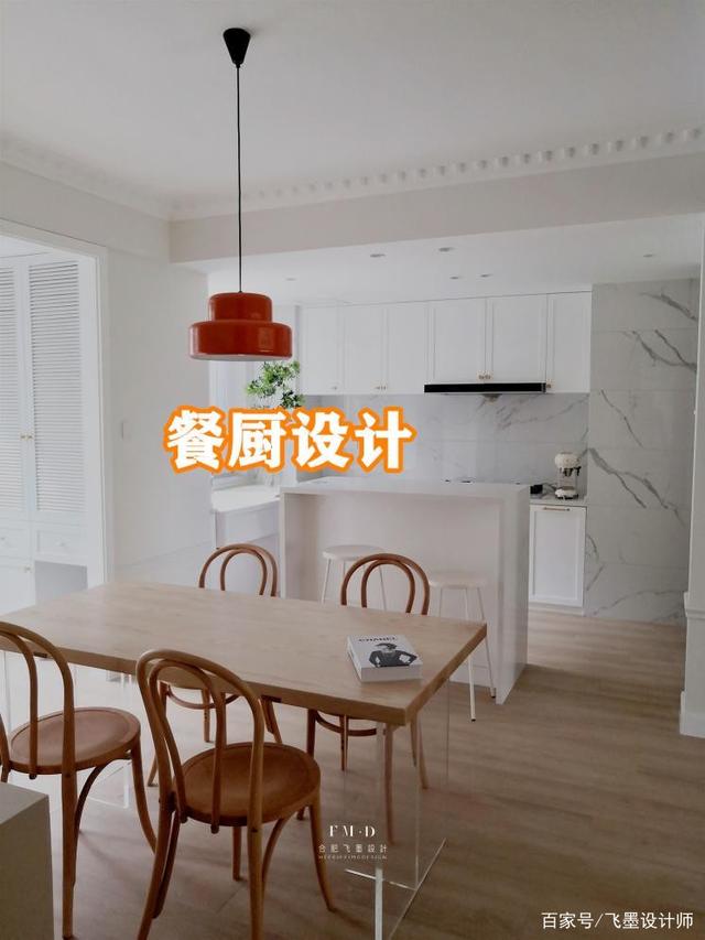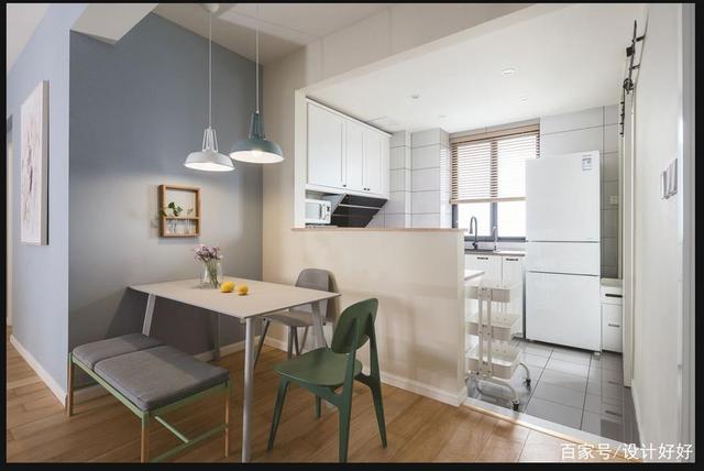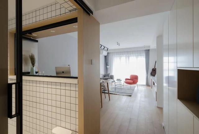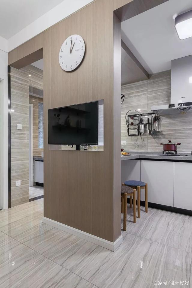 ▲设计后的样子,砸掉原来封闭厨房以及干区的墙体,用进门的收纳柜兼顾门口收纳以及进门玄关,厨房开放布局提升整体光线以及收纳;
