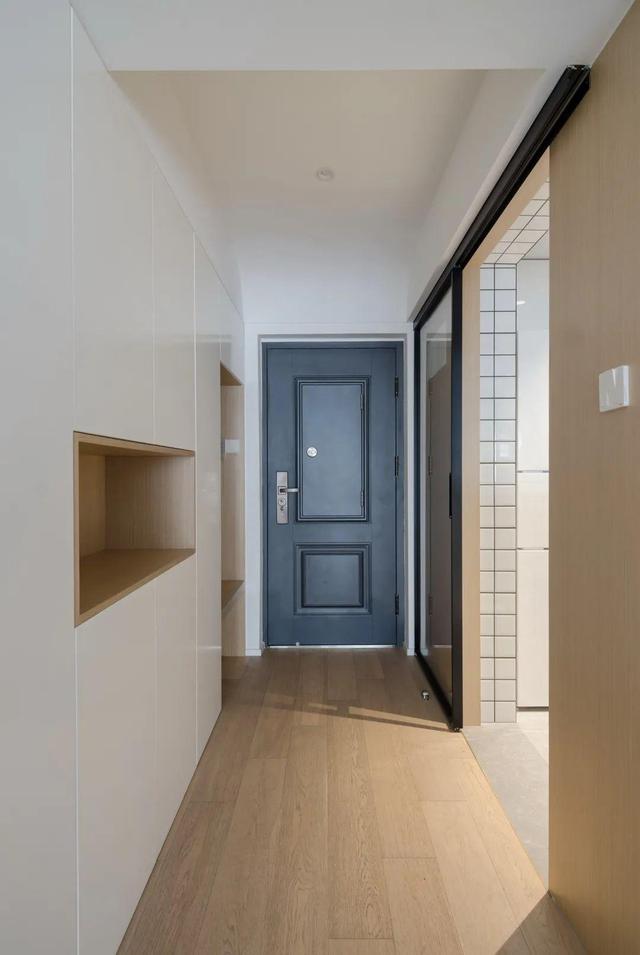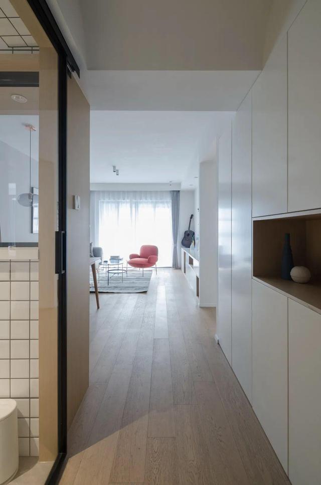 ▲从大门回到家,地面整体木地板材质,一侧是厨房门的推拉门,一侧是定制的鞋柜+换鞋凳组合的定制柜设计,木色与白色的空间,给人以文艺简约的实用氛围感。