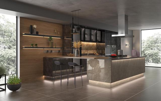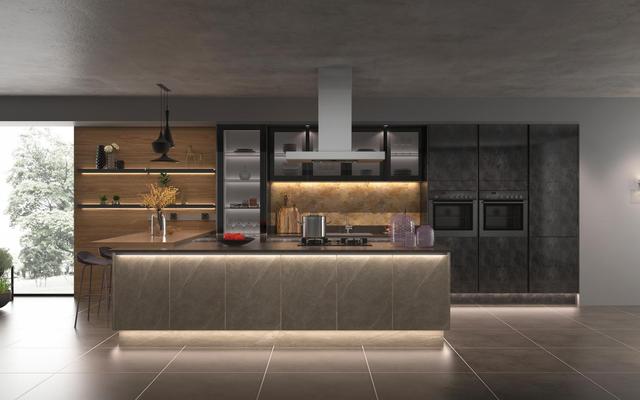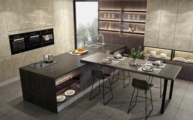 在深色整体橱柜中镶嵌着家用电器,一道高山云岩在灯光的映衬下,仿佛在黑暗中的一簇光火,惊艳动人。