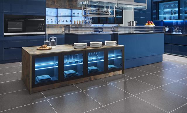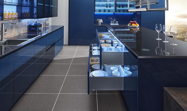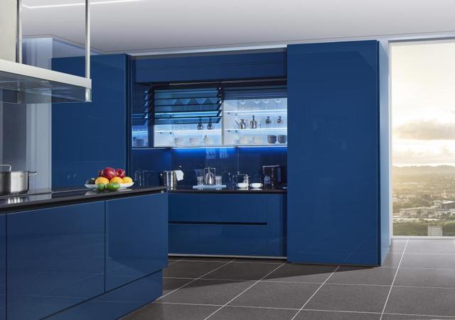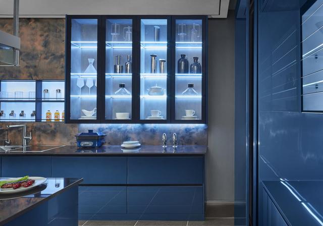 抽屉式的收纳为厨房的收纳能力扩容20%,使用更加方便,柜内大蓝色灯光与橱柜的颜色完美烘托下更加高级,升级了厨房的精致感。