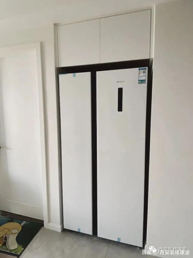 ▲利用主卫局部空间,实现了双开门冰箱的镶嵌,上方吊柜定制,还满足了少量杂物的收纳