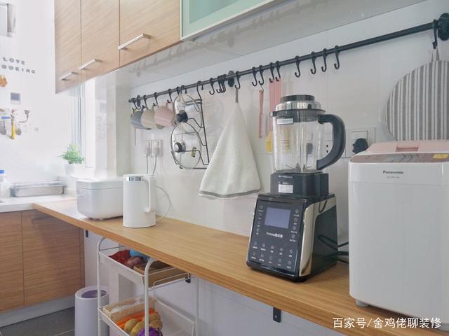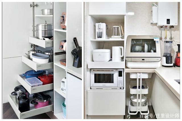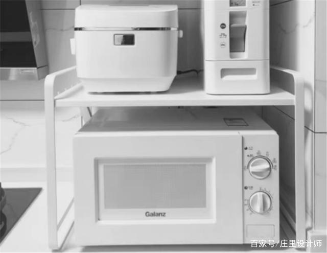 或者在台面放置物架来摆放微波炉等小家电,美观耐用,造价低,不比吊柜香吗?