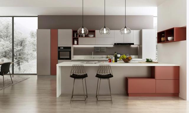 司米同系列的橱柜,还推出了勃艮第红+苍穹灰的色彩搭配,融合时尚的白色台面,完美诠释了轻奢家居设计。