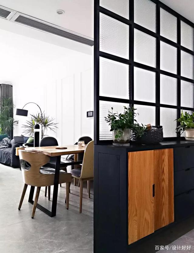 ▲玄关左侧是厨房空间,在黑框推拉门的基础,在厨房与大厅之间以室内窗与中岛台隔断,让没有窗户的厨房也更加明亮,并且通过半开放的设计,提升了宽敞的效果。