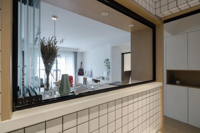 ▲厨房与大厅之间,室内窗装在中岛台上,在厨房就可以观察到大厅区域的情况,提升家里的互动氛围。