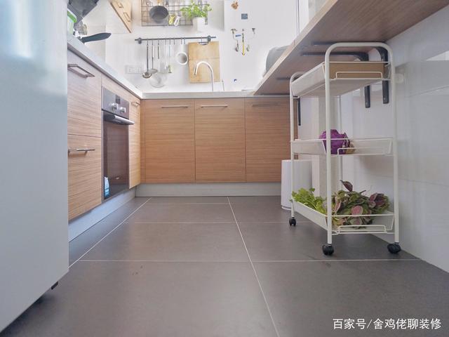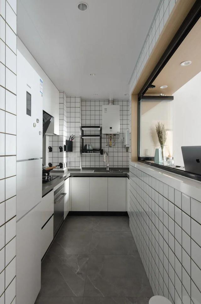 有做饭经验的朋友们都知道,厨房的台面是永远不够用的,所以我希望台面长度自然是做得越长越好!为了能最大限度利用厨房使用空间,U型的橱柜设计是最合理的。厨房地面选用大面积深色地砖、顶面采用图案简单的铝扣板,耐脏好打理。