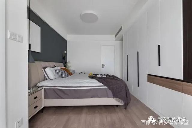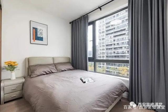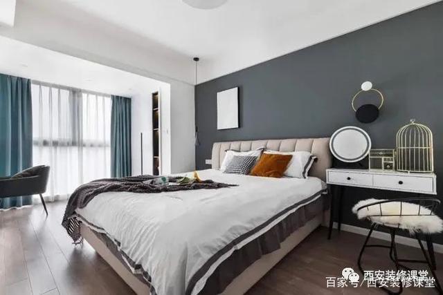 ▲主卧与阳台打通以后,拓展空间,背景深灰色涂刷提升层次感