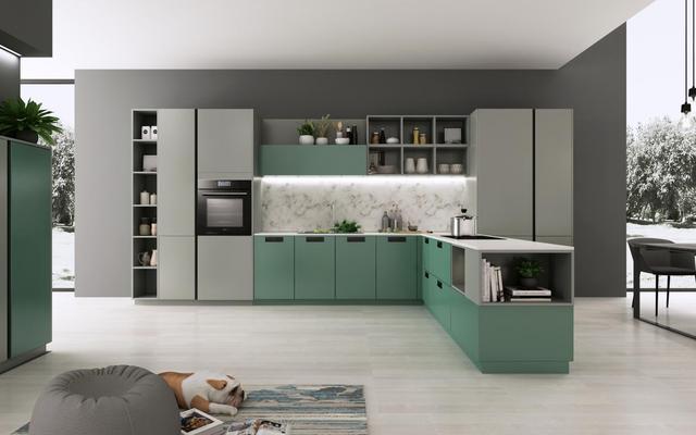 莫兰迪绿为厨房的主色调,与低调的莫兰迪灰色完美搭配,让人仿佛置身于温柔的草地上。