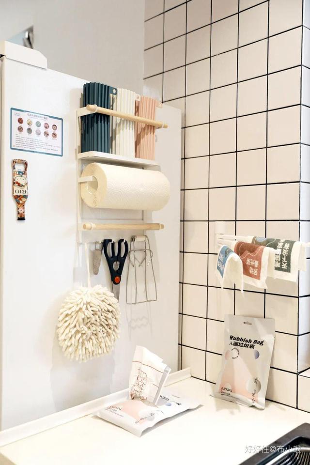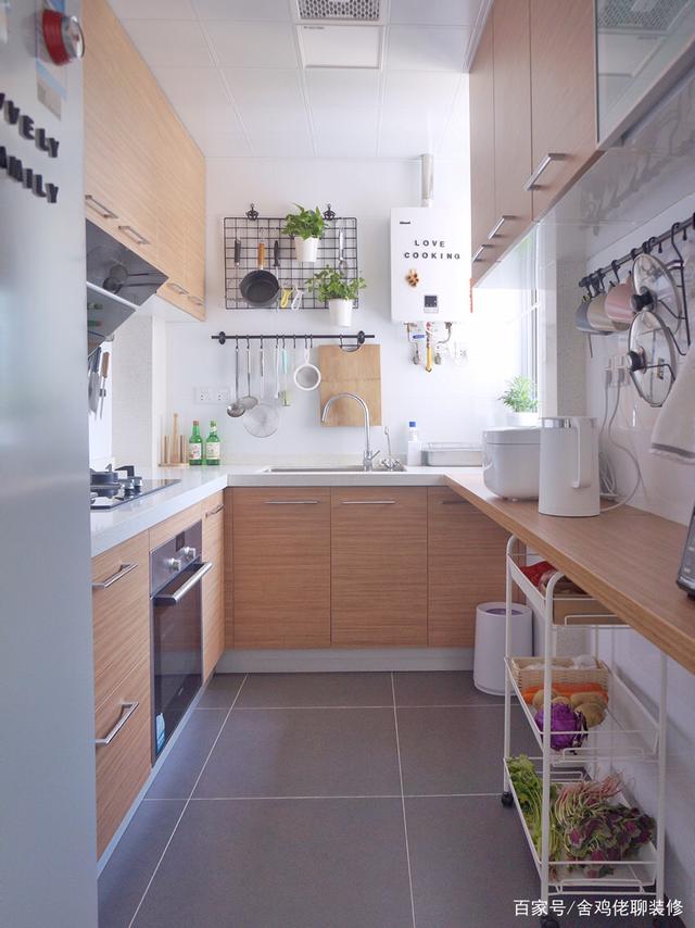 所以我选择了L型橱柜,另外一边也没有浪费,做了一条长搁板,上门可以放置大量小厨电,底部则可以布置垃圾桶、小推车、方便灵活又有颜值。