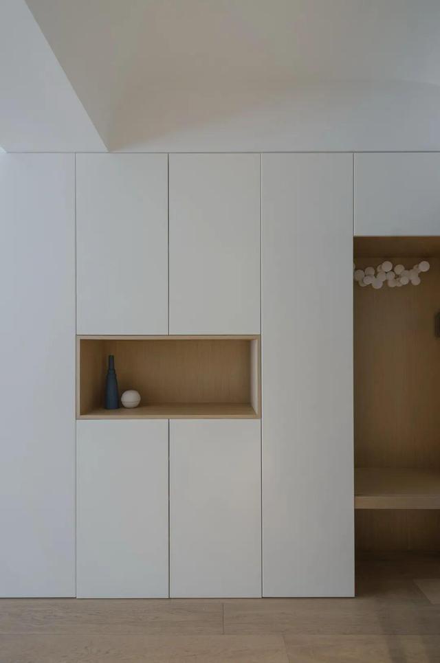当空间结构重新调整之后,一进门就拥有了宽敞的空间体验,并且还让生活动线做到了合理化。鞋柜则是借用进门旁边的过厅空间来设计的,一门到顶的柜体结构,既拥有了大量的收纳能力,也完善了入户的需求。