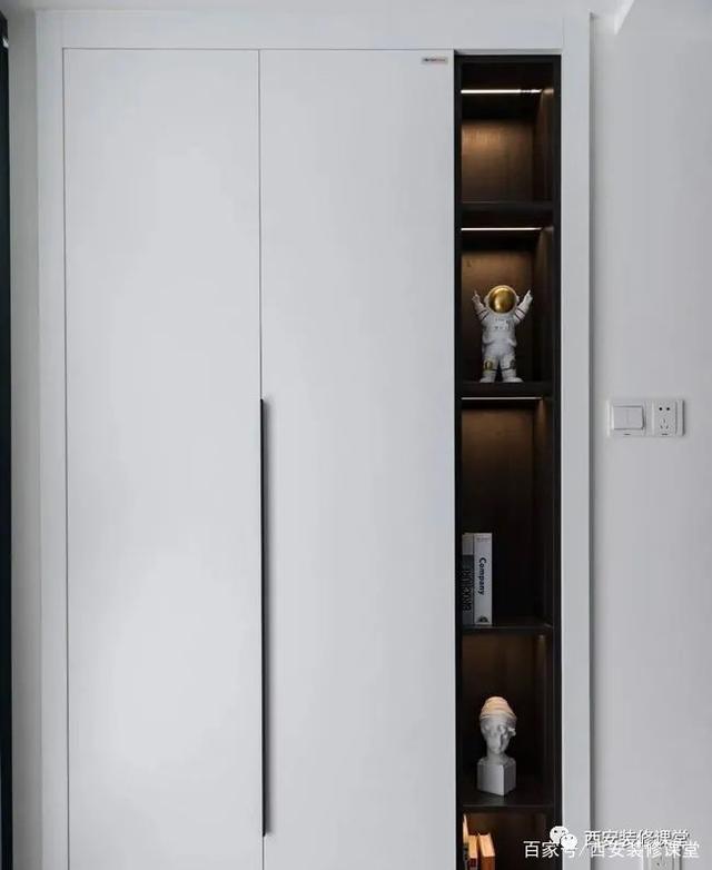 ▲定制鞋柜加入木色空格架,摆上小艺术品,也提升了回家第一空间的仪式感。