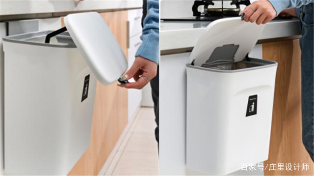个人更推崇将垃圾桶摆放在明面上,更干净卫生。如果橱柜条件满足,还可将垃圾桶直接悬挂在地柜外侧,随时倾倒整理垃圾,非常耐用。