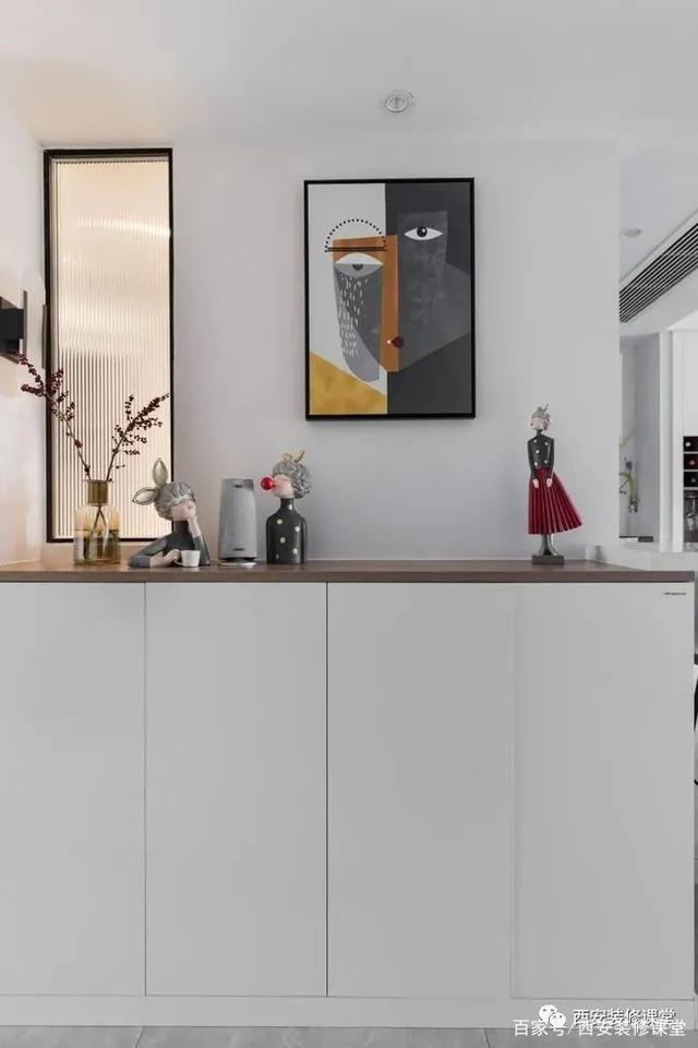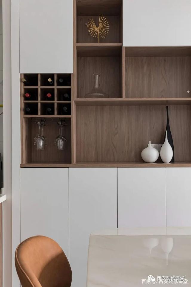 ▲餐边柜白色与木色结合,兼顾水吧台以及少量酒柜功能