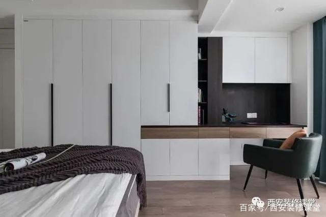 ▲床尾顶天立地的衣柜满足基本收纳,与阳台打通以后,套色设计满足了一个书桌功能