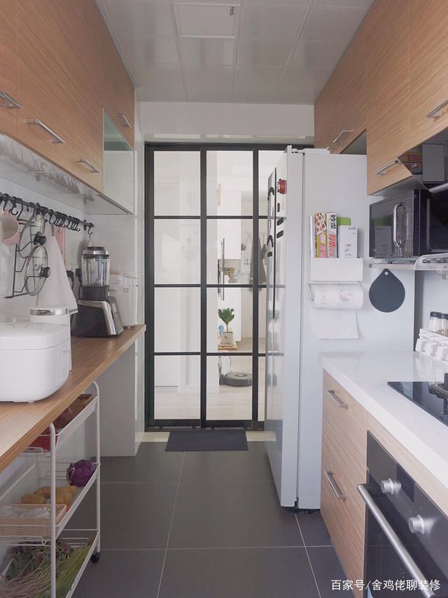 我家的厨房是窄长的一字型,宽度不到1.9m。而橱柜的进深空间一般要求600-650mm,如果做成标准的U型橱柜,中间的活动空间就只剩下半米左右,非常的狭窄。