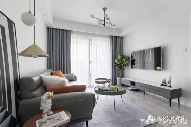 ▲客厅全景,皮质的灰色沙发搭配白色岩板电视柜,两个圆几代替传统茶几,视觉和空间更灵活