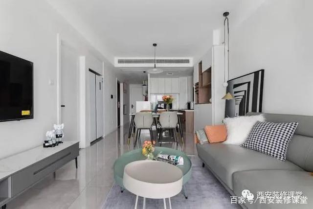 ▲全景空间,白色为主,利用大面积灰色搭配,素雅极简,少量的饱和度低的色彩点缀,提升温馨
