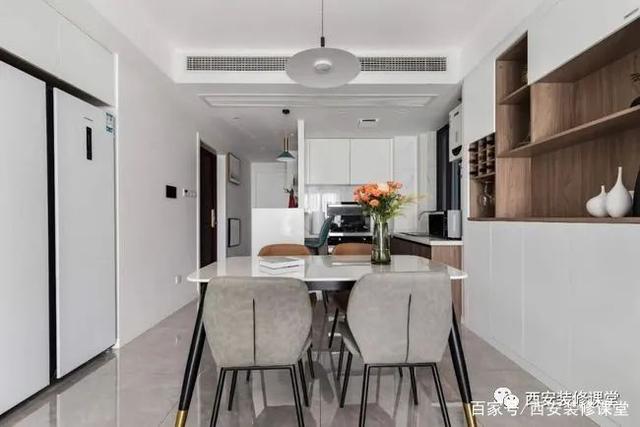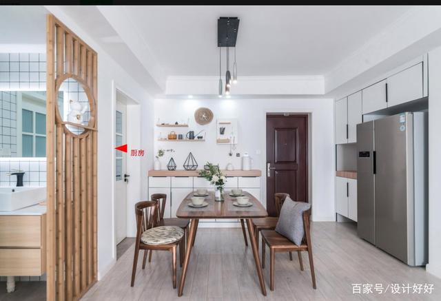 ▲开放厨房以后,橱柜与餐边柜一体定制,四人位餐桌满足基本功能;牺牲主卫空间实现了冰箱的镶嵌