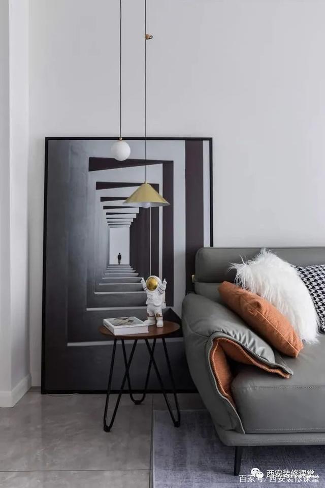 ▲角落空余小的边几搭配时尚吊灯搭配,一副有纵深感的挂画斜靠更有高级感
