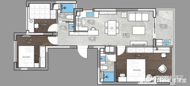 2、原客厅与原主卧打通,并以套间功能来设计,从而实现双卧向阳的空间结构。
