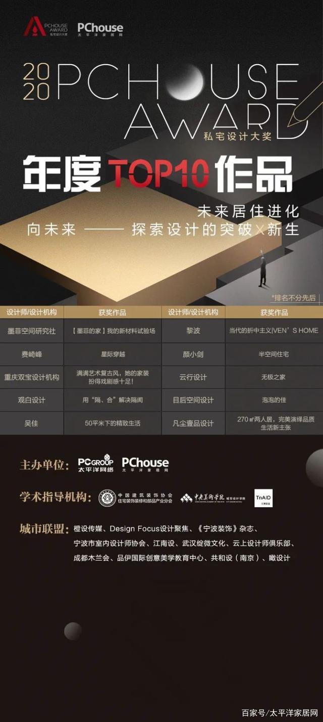 在经历了大赛组委会初审,大赛专家评审们的层层筛选后,2020PChouse Award私宅设计大奖年度TOP10佳作从参赛的8700余作品中崭露头角,可谓优中选优的私宅佳作,十个作品,十种生活,设计师用自己的专业能力,以及个人对居住者生活方式的解读再现,呈现思考当下,更探索未来。恭喜这十套作品的设计师们!