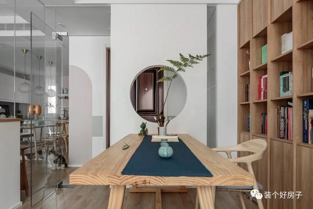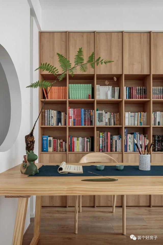 将书房改造后,在与玄关相邻的墙面开了一扇圆窗。窗内是书房摆放着的金毛狗蕨,从入户进来就可以看到对面的端景。