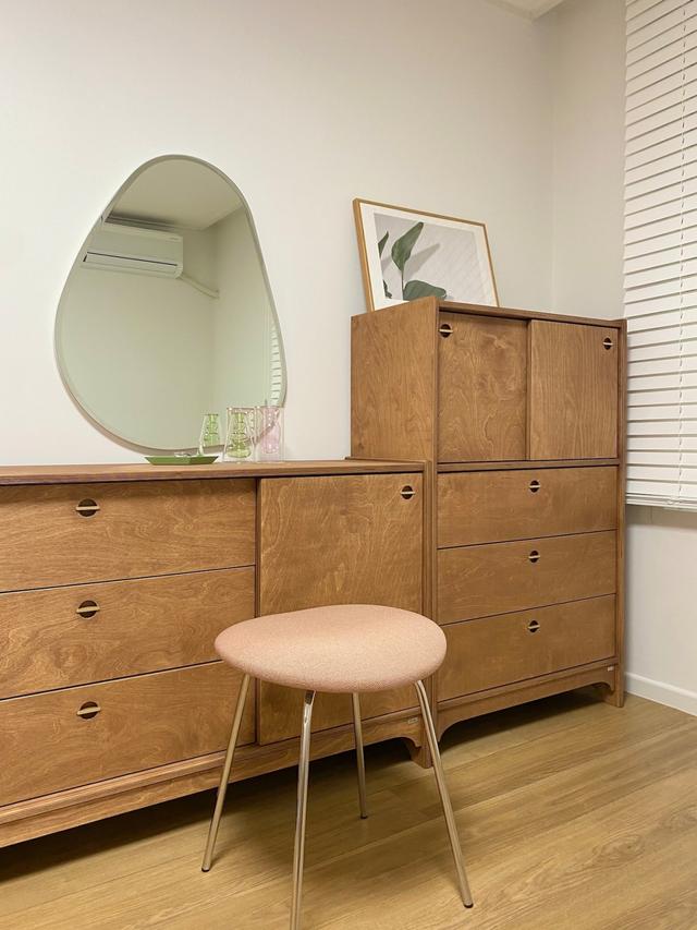 女屋主主卧的梳妆台也选购了一款类似水滴形状的化妆镜,柔和的线条感进一步渲染了温馨的气息。