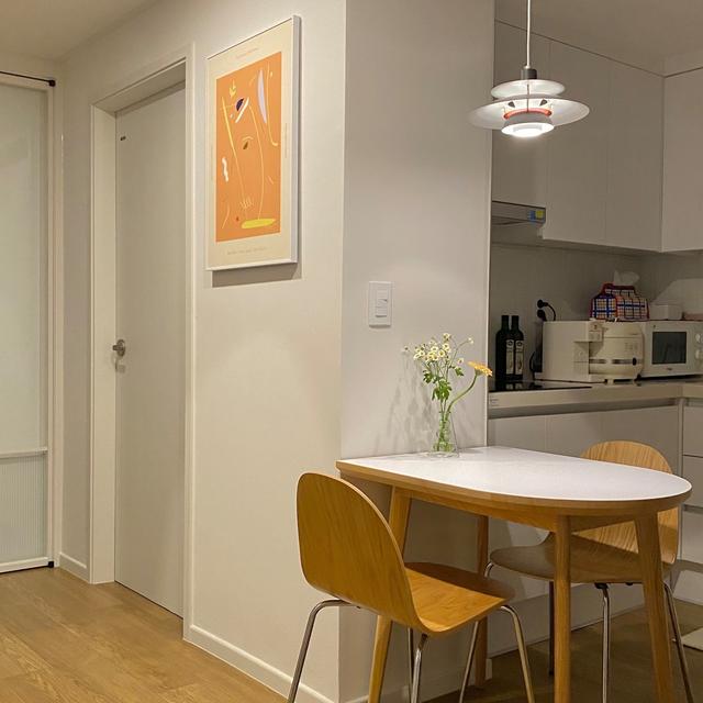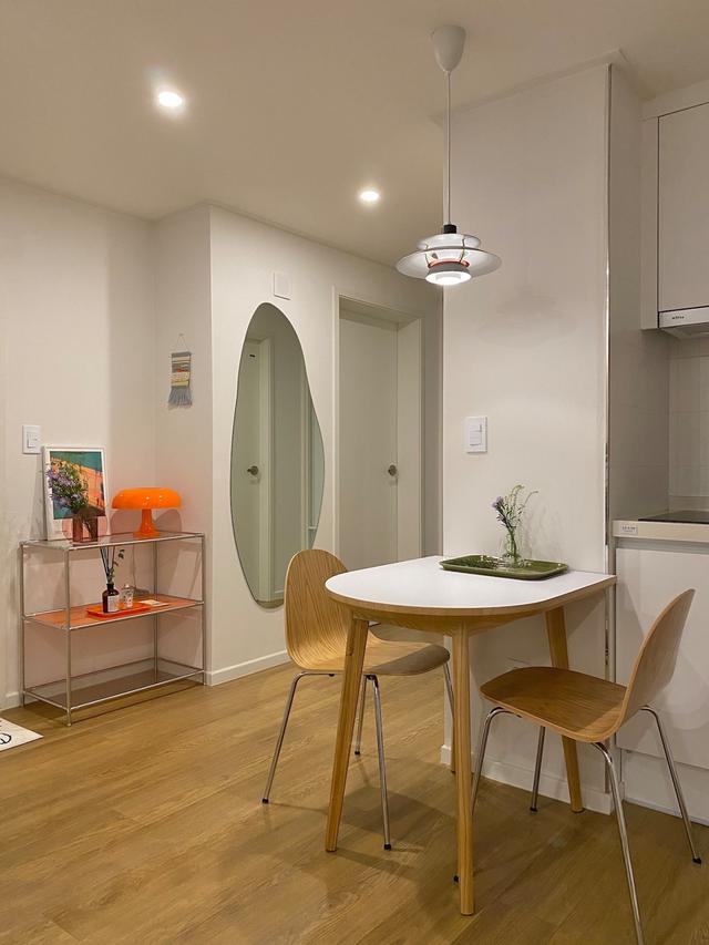 这种半个椭圆形的餐桌也太实用了,可以很好地和墙面贴合在一起,非常节省空间,适合平时两个人的简餐。