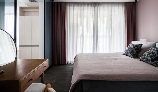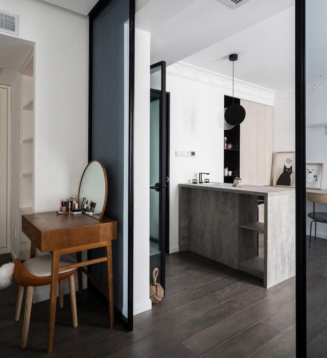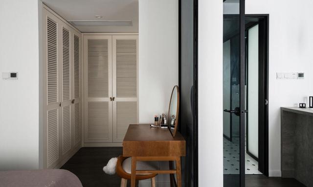 原过厅纳入主卧之后,则是以步入式衣帽间来设计的,以满足每个女孩对大储物间的梦想。而当南边两个房间打通之后,还是保留了移门隔断,从而实现隔而不断的空间结构。