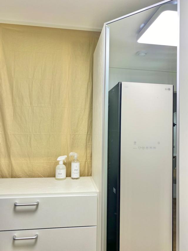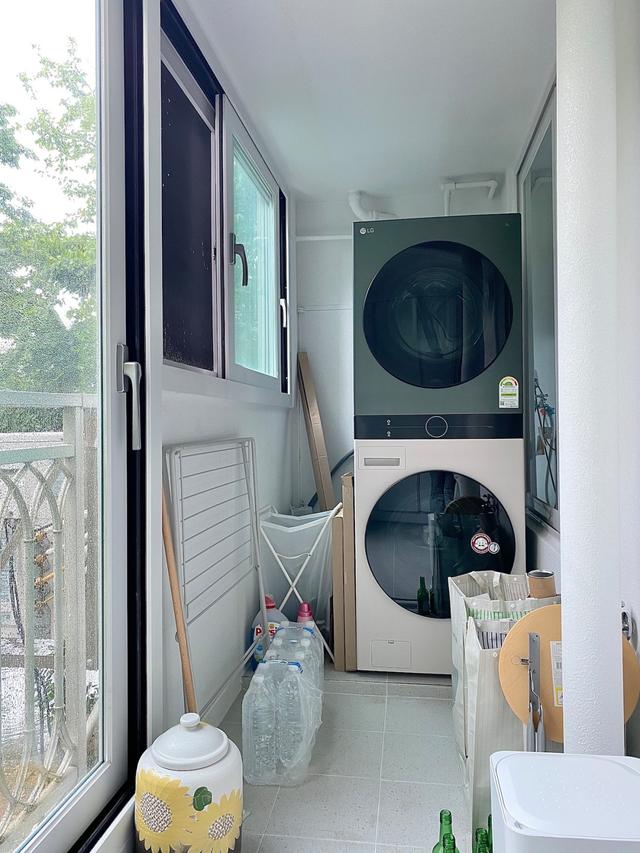 大大的阳台连接着卧室和客厅,屋主将靠近主卧的位置规划为家政区,这里摆放了洗衣机、烘干机、脏衣娄等等。