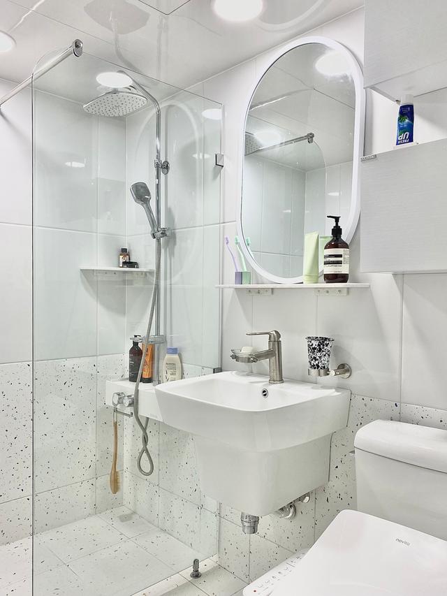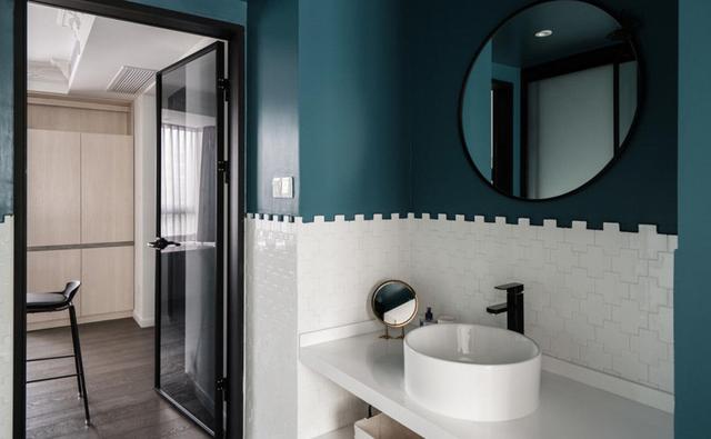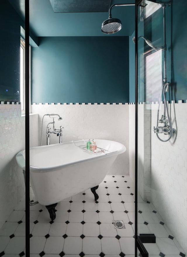 白色的小花砖,墨色的防水墙,再搭配上一个猫脚浴缸,既给人一种精致的视觉感受,又不失复古浪漫的气息。同时,为了保证空间的整洁度,洗澡与马桶区之间,也安装上了移门隔断,以避免积水外溢。
