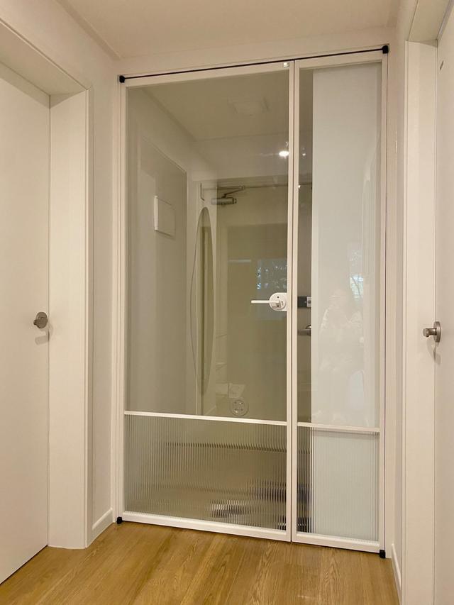 本案例的玄关也用一扇室内门来分隔内外,极窄的白色边框搭配通透玻璃的形式,最大程度上地减轻它的体量感和存在感,这样设计既可以有效隔断灰尘又保证了玄关的明亮度,让回家变得更有仪式感。