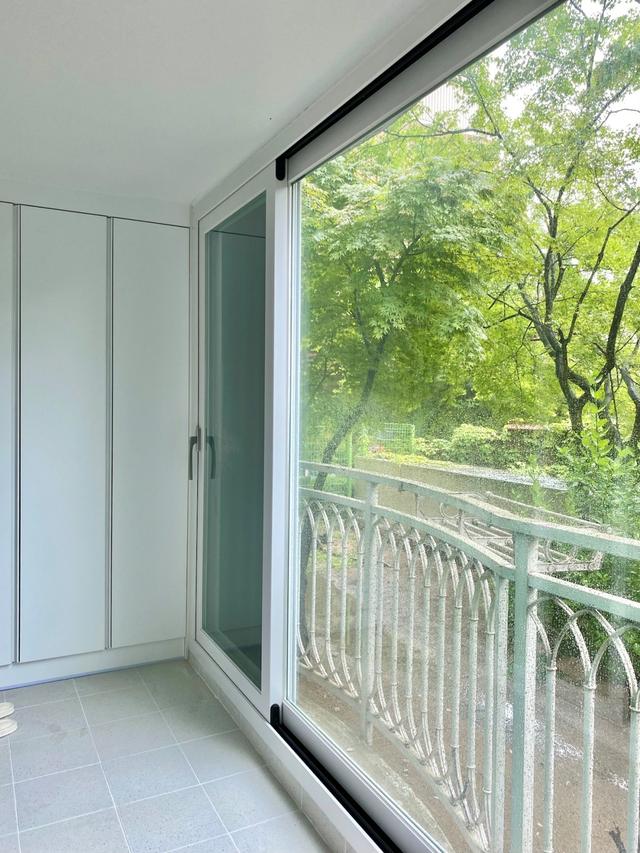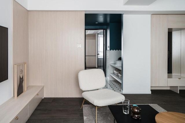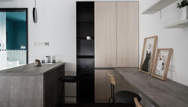 当取消家里的厨房之后,原位置则设计了两组储物柜,一组到顶并做封闭式,可以解决杂物及衣物的收纳需求。另一组则是以定制的方式,做了一个玻璃展示柜,以收纳屋主心爱的手办。当然,该展示柜不做到顶,也是为了避开顶部的空调进出风口。而外面的小阳台,则是在配置一组储物柜后,以休闲区来定位的,从而为空间延伸出了一块阅读角落。