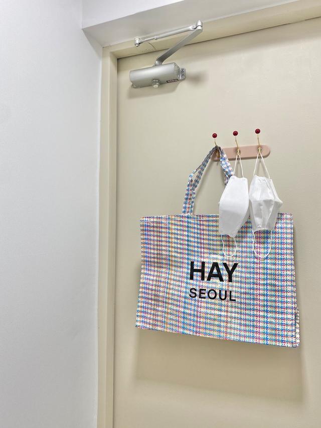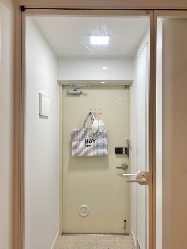 在入户门的位置沾上一个简单的挂钩,就可以用来收纳口罩、出门购物用的布袋子,不会弄脏墙面的同时,进出门拿取也很方便。