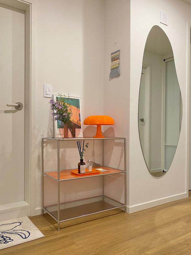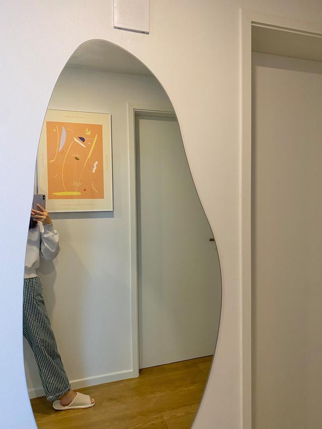 怎么让你的小家变得更有个性和艺术感呢,不妨就学本案例的博主那样,让平时常用的穿衣镜变身一下,带有不规则曲线的镜子造型感十足,凹造型再也不用怕修图。一个小小的细节就让家看起来变得更有趣。