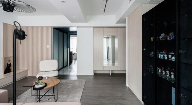 当空间结构重新调整之后,一进门就拥有了宽敞的空间体验,并且还让生活动线做到了合理化。鞋柜则是借用进门旁边的过厅空间来设计的,一门到顶的柜体结构,既拥有了大量的收纳能力,也完善了入户的需求。