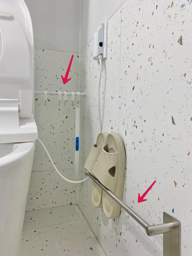 屋主还利用马桶和水箱之间的距离,采用了收纳伸缩杆的设计来悬挂马桶刷,这样可以不污染墙面,值得借鉴。