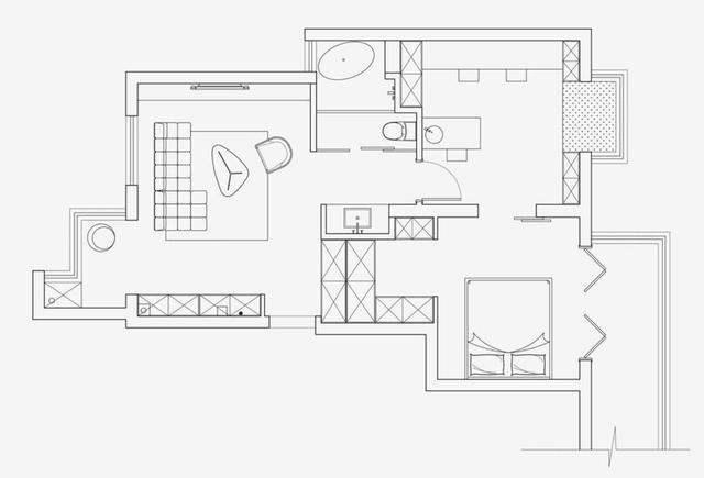 由于屋主是一个人居住,且原主卧面积有限,所以将原客厅改成主卧,并以套间的结构来布局,既让两个房间实现了向阳的采光,又融合了多种空间功能。