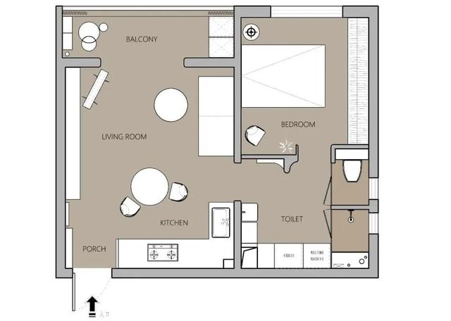 2. 将厨房外移至进门右手区域,将客餐厨打通,做了LDK一体化设计,公私区域互不打扰;