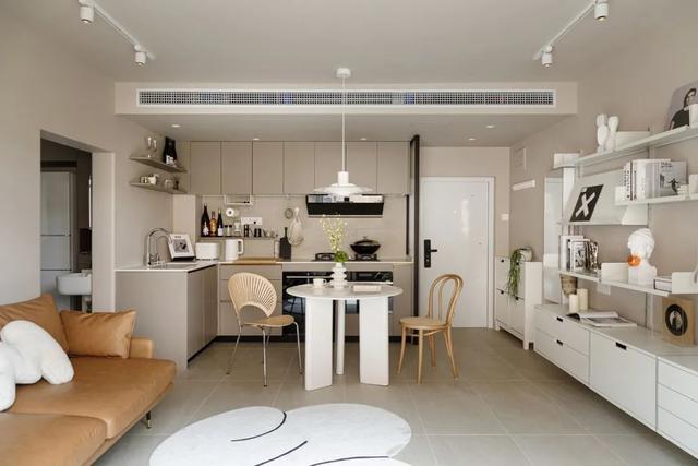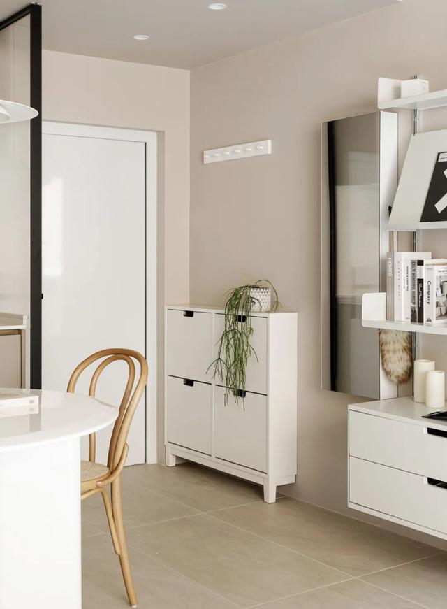 ▲餐厅实拍图这套房子的最大特点就是「小而精美」,而且地处城市中心,离地铁口很近,日常上下班交通非常方便。走进屋内,首先看到的是一个小巧的玄关,由玄关柜和穿鞋凳组成。玄关柜做了“顶天立地”的设计,其中一扇柜门替换成了玻璃镜,方便屋主整理仪容;穿鞋凳做了镂空的设计,里面可以放8双鞋子,简洁实用。