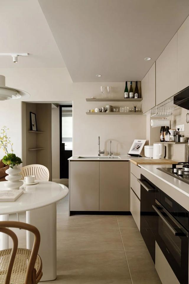 沿墙面打造的L型布局,保证了“洗-切-炒”动线流畅。柜体采用了与墙面一致的奶茶色,可以更好的融为一体,弱化存在感。