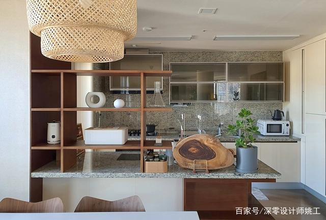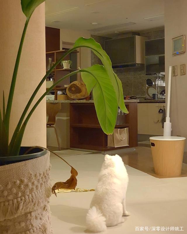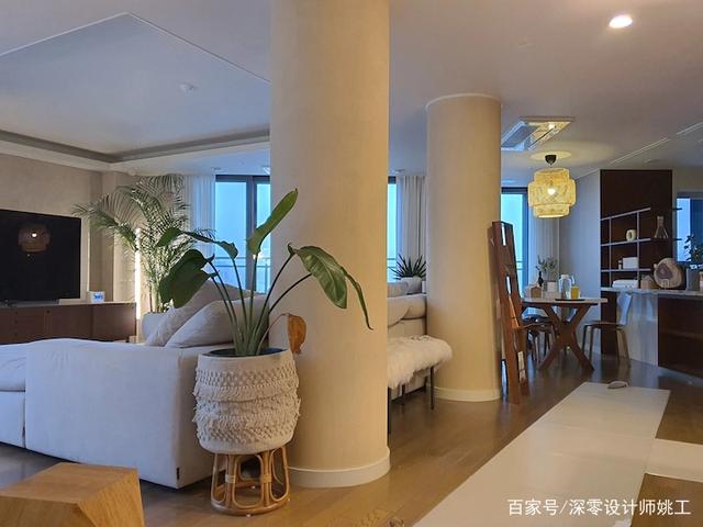 承重立柱处理得当就是加分项,他家顺势用来划分客餐厨区域,如果不是特别粗厚的情况,更建议大家根据需求定制成悬空桌,背后是书房或休闲吧台的布置实用性更强。