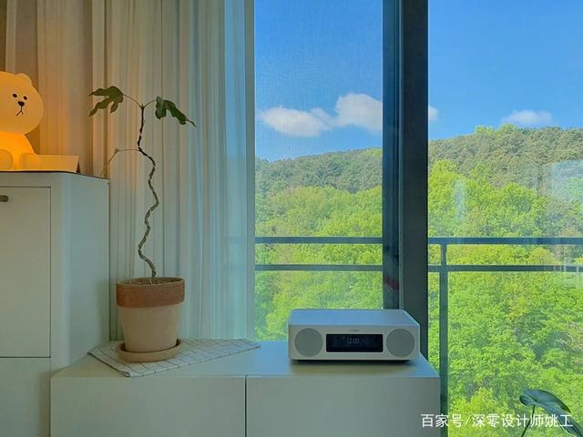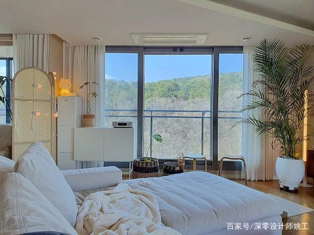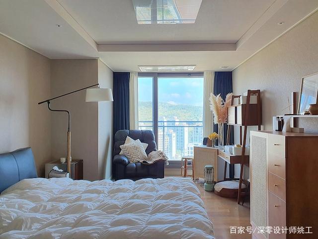 大自然的美景就是最好的装饰,主卧也拥有一面落地窗,所以在硬装上就尽量从简,以原木、白色、裸色为主,清新舒适,很治愈。